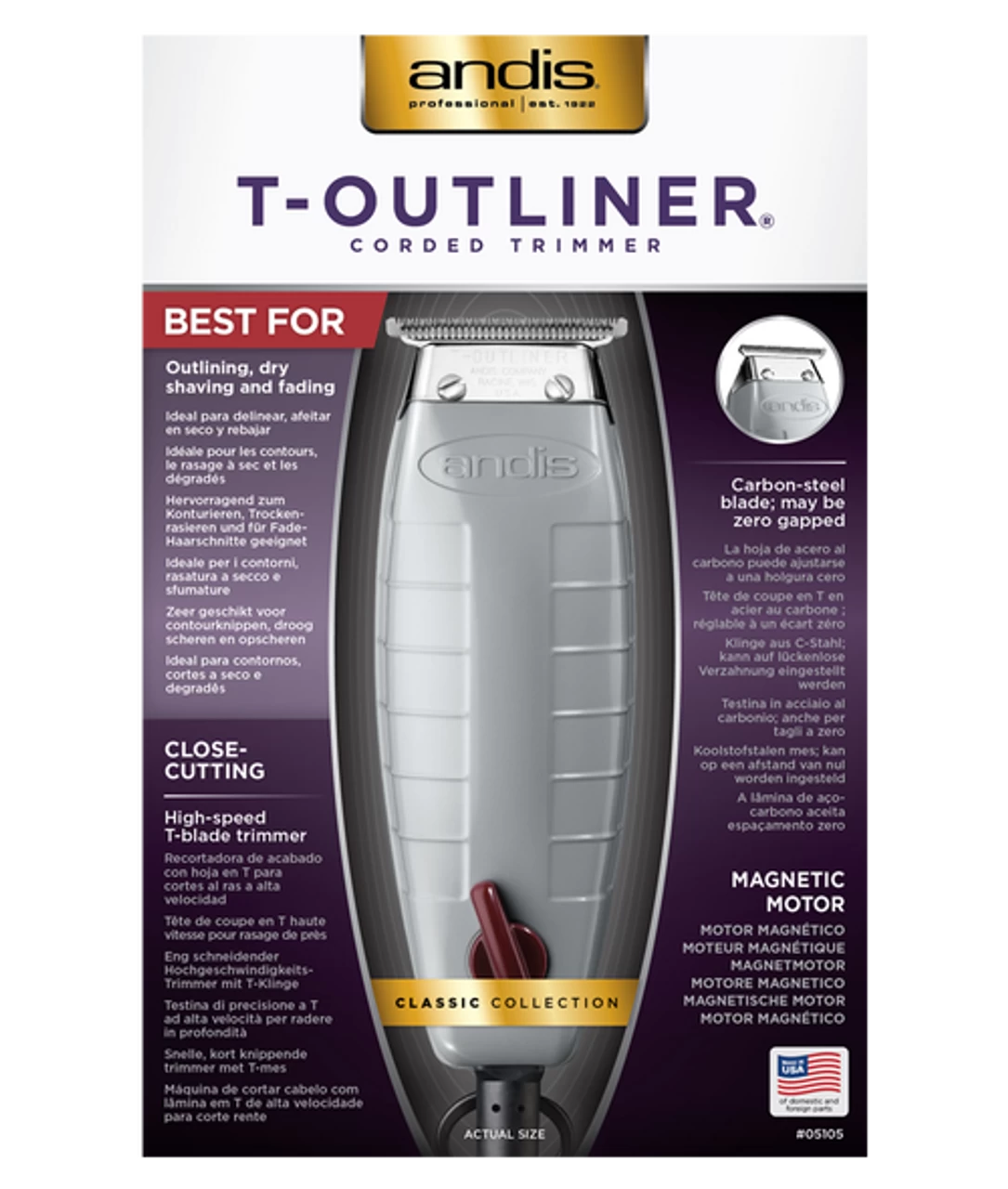 • Magnetic motor trimmer-the professional standard for all -around outlining, dry shaving and fading. • Close-cutting, carbon-steel T-blade for detailing. • Powerful, high-speed motor runs cool and quiet. • Contoured housing fits comfortably in your hand. • Heavy-duty 2.5 meter cord with hanger loop.